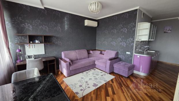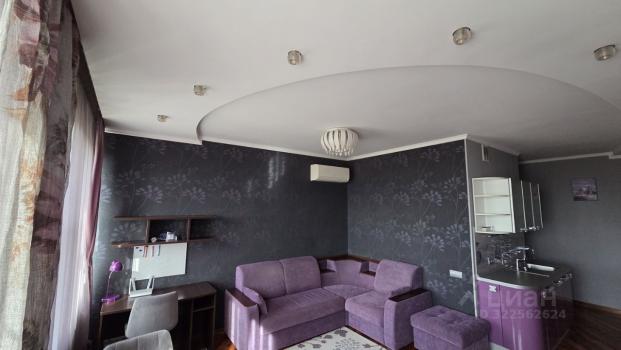 Квартира состоит из гостиной + кухня, спальни, и ванной комнаты. Гостиная, залитая естественным светом, обставлена мягкой мебелью.