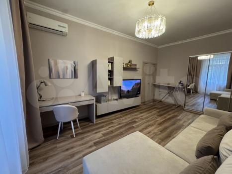 В гостиной так же мебель новая, установлен кондиционер, огромный удобный диван, вместительный шкаф, гладильная доска с парогенератором, письменный стол, и гостиный гарнитур с телевизором 50". Из гостиной есть выход на балкон с видом на сквер.