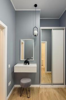 В квартире выполнен дизайнерский ремонт, что придает ей современный и уютный вид. Комнаты меблированы, есть все необходимое для комфортного проживания: кондиционер, холодильник, посудомоечная и стиральная машины, а также телевизор. Кухня оборудована современной мебелью и техникой. В ванной комнате установлена душевая кабина.