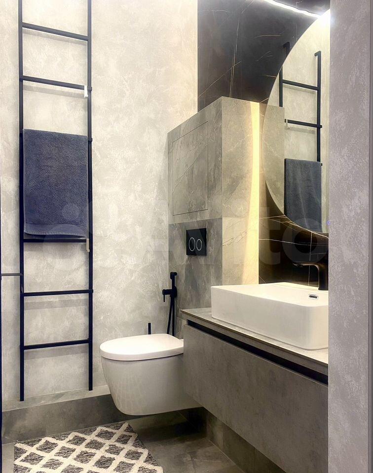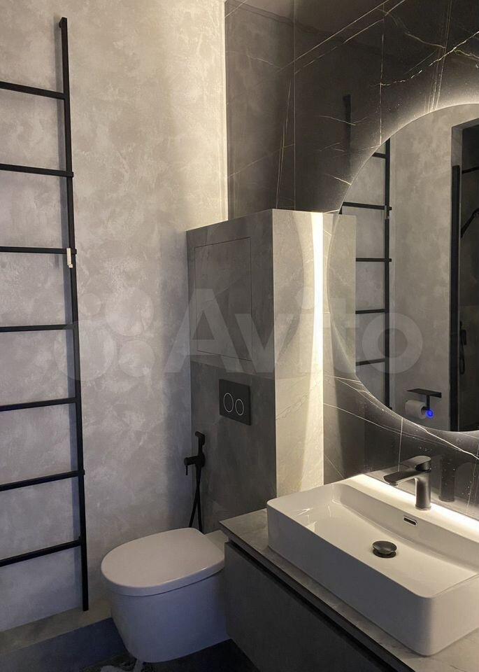✅ Два санузла: основной с ванной, унитазом, раковиной, стиральной машиной, напольным шкафом и зеркалом-шкафом с подсветкой; второй с унитазом, раковиной и зеркалом;