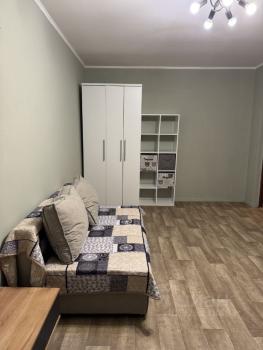 В квартире выполнен косметический ремонт. Из мебели имеется удобный диван и вместительный шкаф. В кухне установлена современная бытовая техника, включая холодильник и стиральную машину. Также имеется микроволновая печь и обеденный стол.
