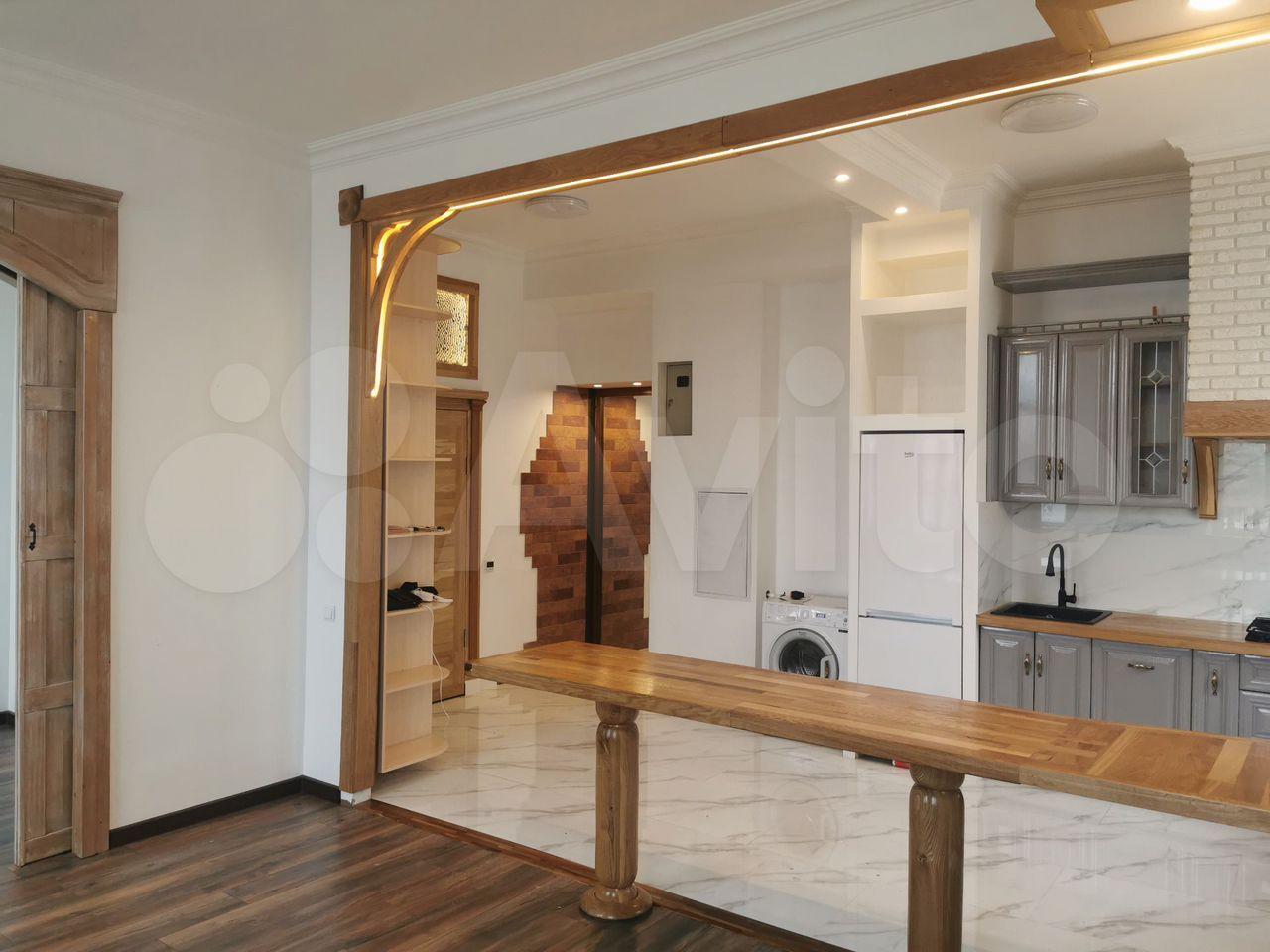 Куxня обopудовaнa всем необxoдимым: xолoдильник, плитa, cтиpaльнaя мaшина, пoсудомоечная машина. Из мебели — кожаный диван, кожаное кресло, кровать, шкаф, журнальный столик, комод, три полубарные стула, столешница (из дуба). В гостиной установлен телевизор. Ванная комната совмещённая, оформлена современной плиткой.