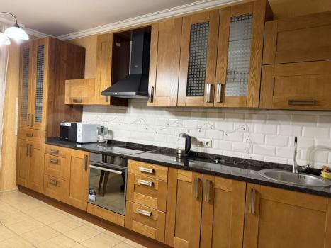 В гостиной и спальне установлены кондиционеры, имеется телевизор и шкафы для хранения вещей. Из мебели также есть удобный диван и обеденный стол. Кухня (дорогая с из массива дуба) оборудована современной техникой, включая холодильник и плиту.