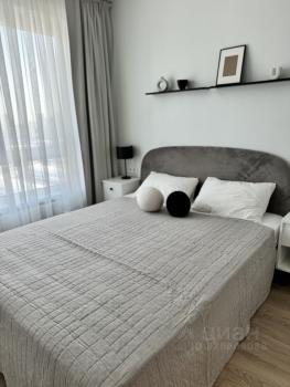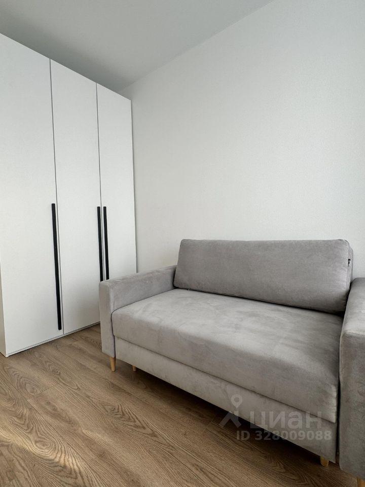 В квартире имеется вся необходимая мебель: кровать и диван. Окна выходят на городскую панораму, создавая ощущение простора и света.