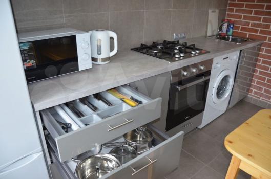 санузел - совмещённый, мебель - кухня, хранение одежды, спальные места, холодильник, плита, микроволновка, стиральная машина.