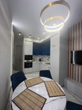 Квартира оборудована: 2 распашных шкафа, широкая кровать (160 см) с ортопедическим матрасом, диван (раскладывается в большое спальное место), кухонный стол и стулья, рабочий (компьютерный) стол, холодильник, духовой шкаф, плита, посудомойка, вытяжка, микроволновка, стиральная машина, кондиционер, смарт-телевизор.