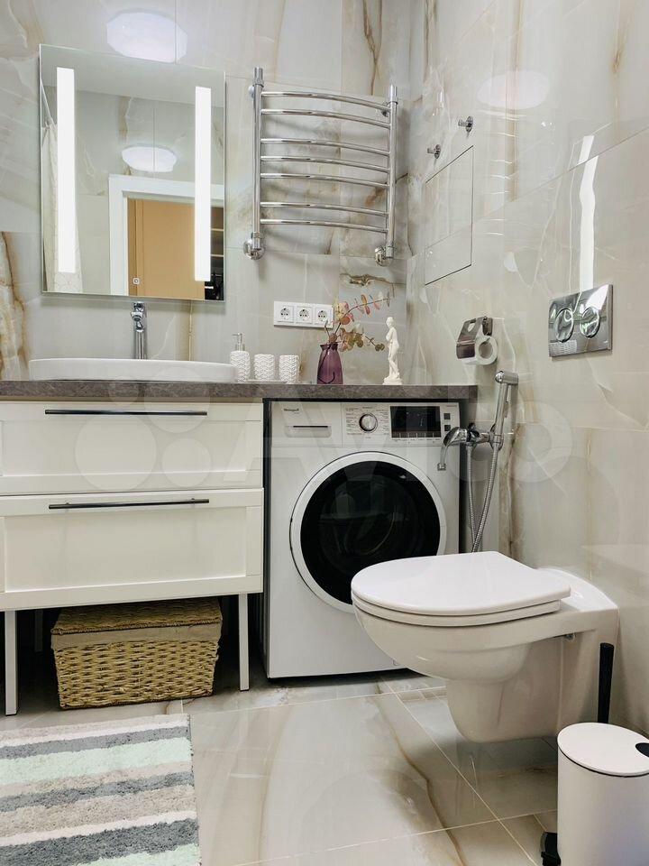 В санузле зеркало с подсветкой и обогревом, стиральная машина и сушилка .