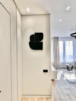- гостиная зона: телевизор, диван (раскладывается), дизайнерский стильный журнальный столик, настенные часы, торшер, бра, уютный ковер, тумба подвесная;