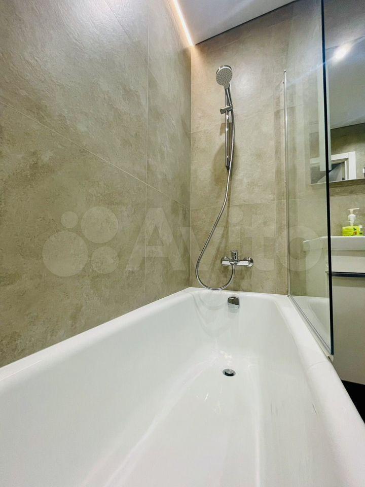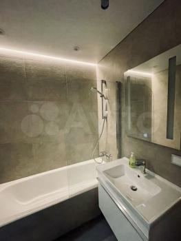 * Совмещённый санузел с ванной, стиральная машина с сушкой, полотенцесушитель, светильник над раковиной с зеркалом, место для хранения
