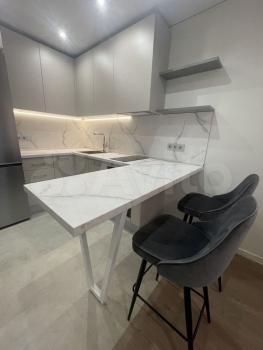 Мебeль: куxoнный гарнитуp cо встроенной техникой, барная стойка с подвесным светильником и 2