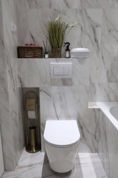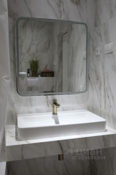 - просторная стильная ванная комната с душевой кабиной и зеркалом с подсветкой.