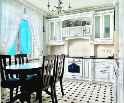 Кухня со встроенной бытовой техникой премиальных брендов ( NEFF, SMEG, BOSH): вместительный холодильник, отдельно встроенный морозильный шкаф, варочная панель; духовой шкаф с пиролизом и аэрогрилем; посудомоечная машина, вытяжка. Каменная натуральная столешница. Встроенная система фильтрации воды. Обеденный стол для четырех человек, который раскладывается для бОльшего количества гостей (до 8 чел)