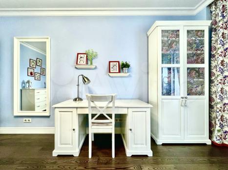 Большая детская комната, который возможно переоборудовать под вторую спальню или кабинет: удобный письменный стол, шкаф для книг и вместительный комод для одежды. Французское окно ведет на лоджию встроенным шкафом для бытовых нужд