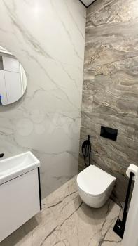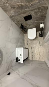 5) санузел с подвесным унитазом и гигиеническим душем + раковина с тумбой для хранения аксессуаров для туалетной комнаты, зеркало с подсветкой , канальная вытяжка