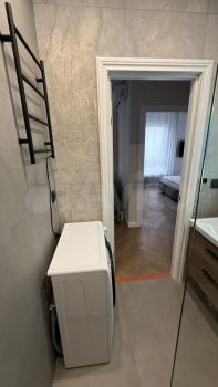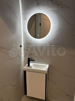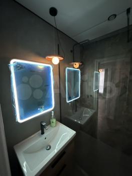 6) душевая комната : премиальная душевая стойка с тропическим ливнем , стеклянная перегородка, большая раковина с тумбой, электрический полотенцесушитель, стиральная машина САNDY 6кг, канальная вытяжка и зеркало с подсветкой