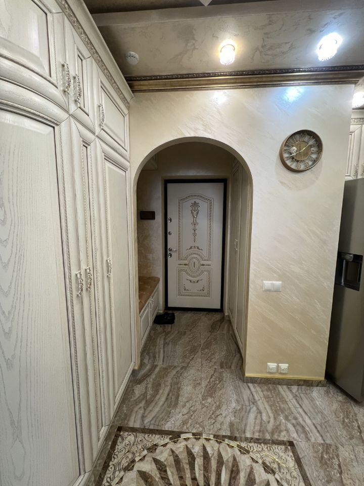 Прихожая с гардеробом и большим трехдверным стеклянным шкафом, изолированные спальни (две спальни детские 20м2, одна взрослая с большой кроватью и гардеробом), свободная гостиная с арочным входом в кухню.