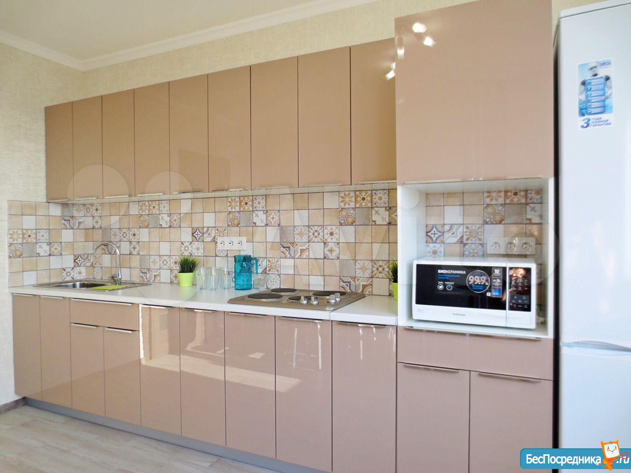 Большая кухня оборудованная всей необходимой современной техникой (холодильник, СВЧ, варочная панель).