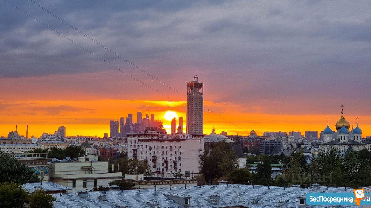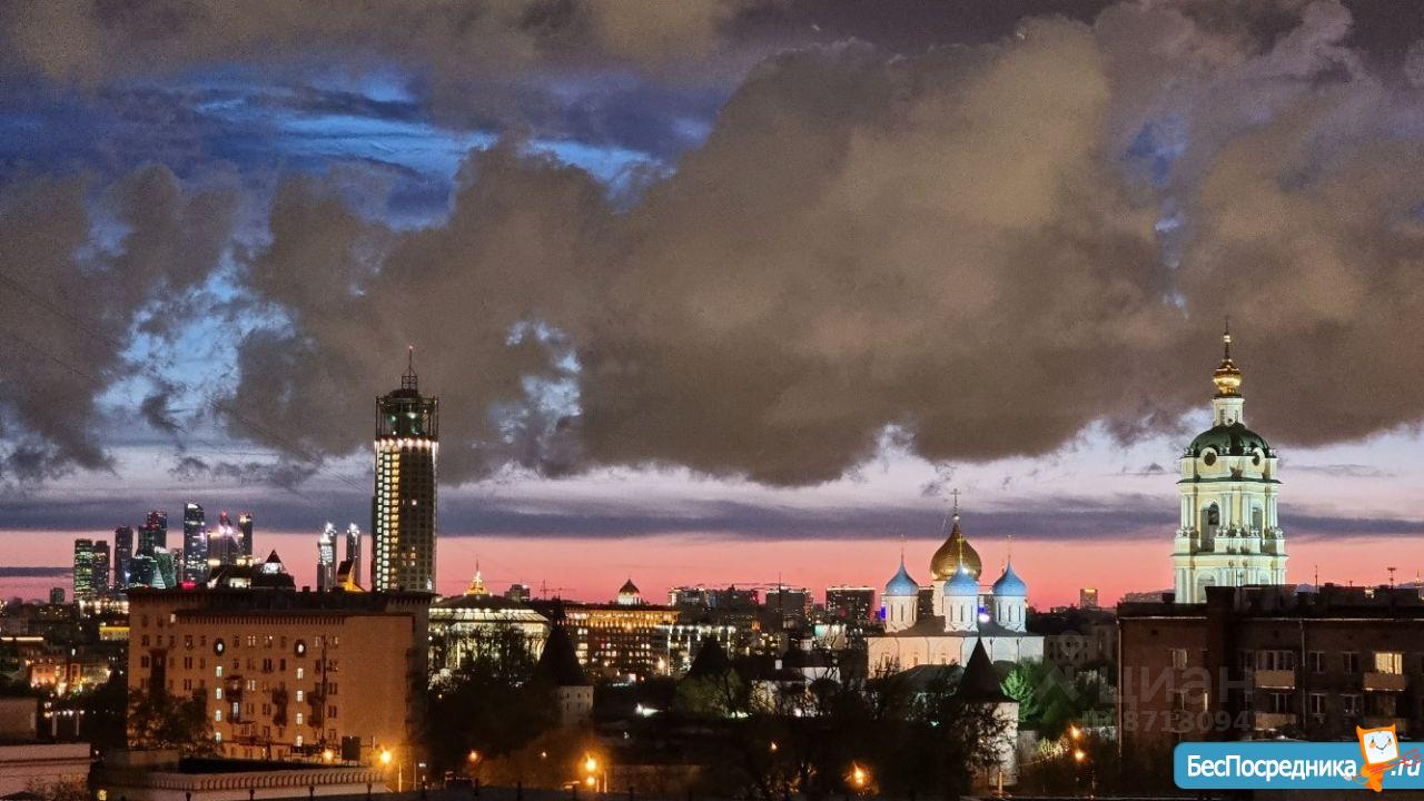 Панорамные окна в пол, вид на центр Москвы: видны Храм Христа спасителя, Москва-Сити, Красные холмы, Новоспасский монастырь.