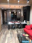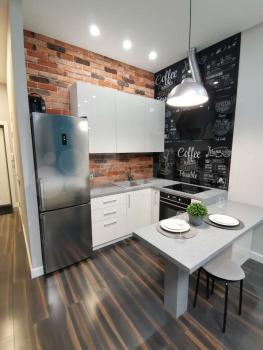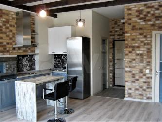 В зоне кухни вместительный холодильник и полноценный гарнитур с двойной мойкой, духовым шкафом, 4 конфорочной варочной панелью и вытяжкой. Обеденная зона представлена длинной и широкой барной столешницей, которая равно подойдет для комфортной работы за ноутбуком.