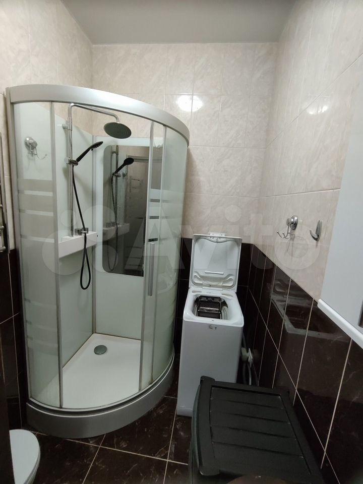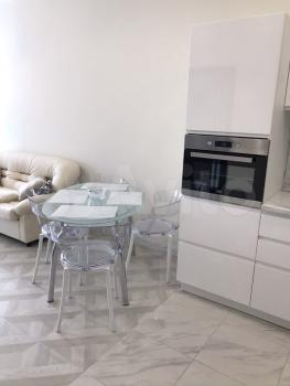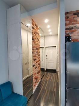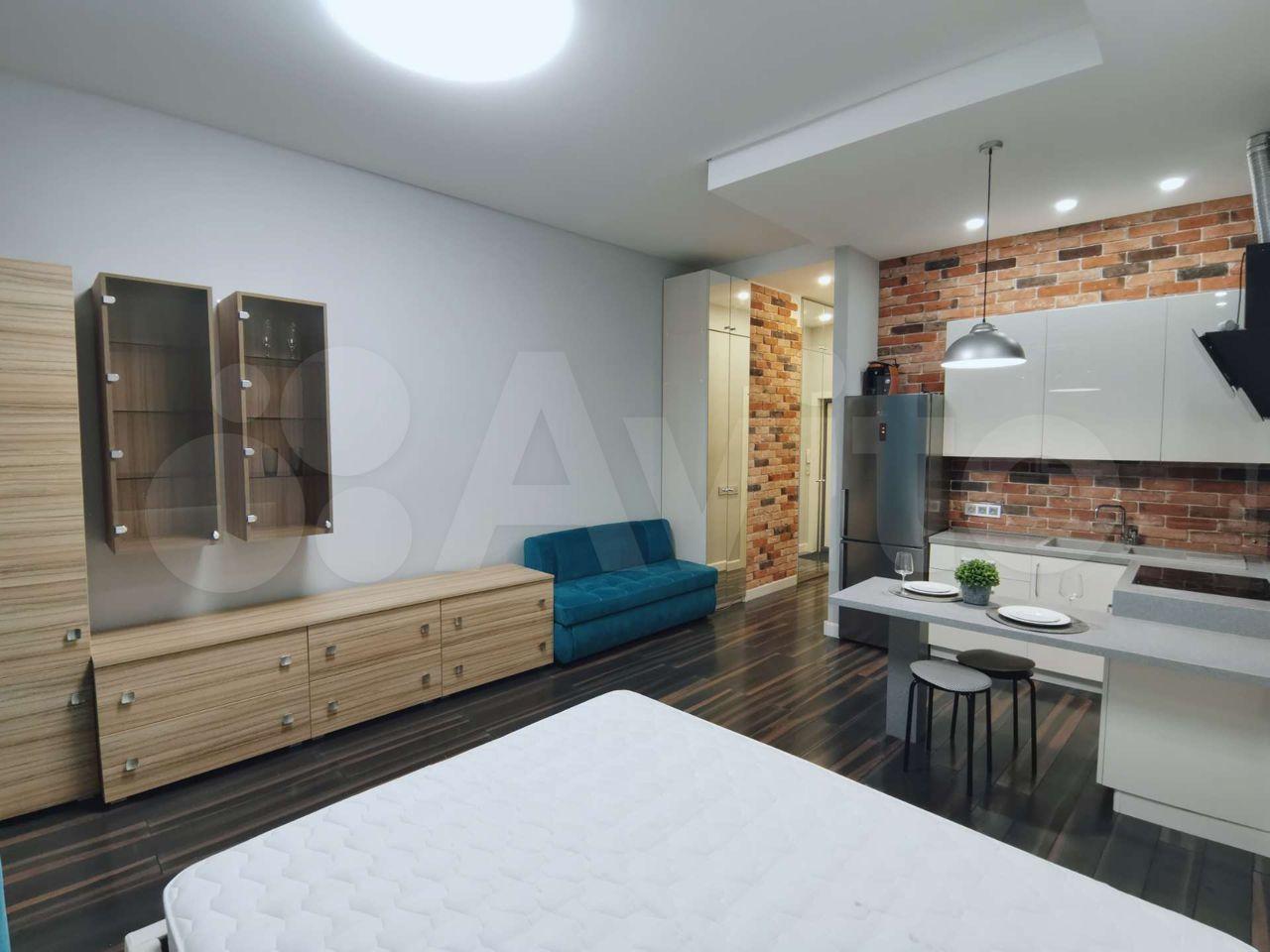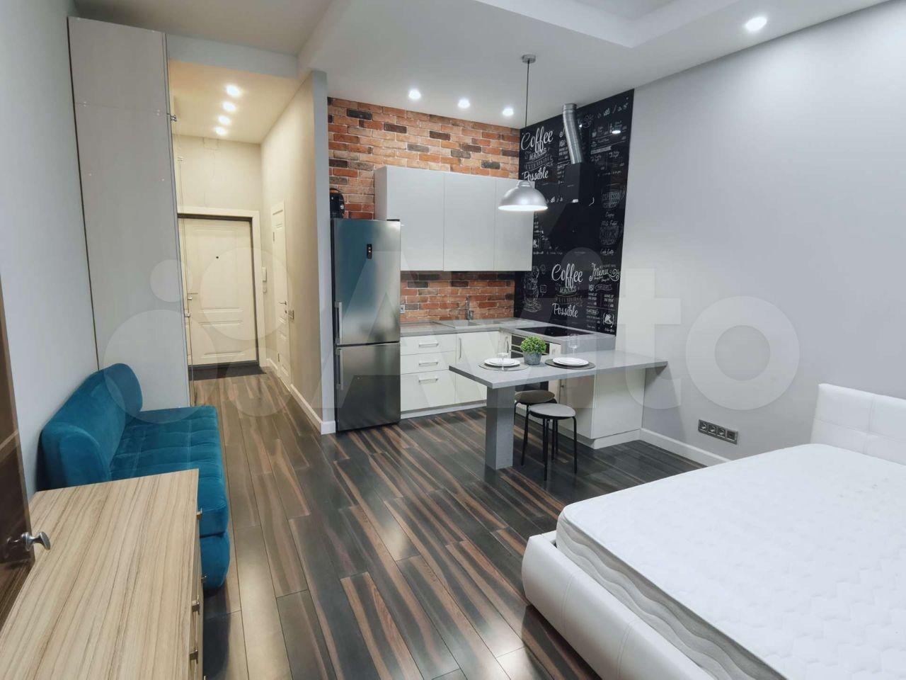 Квартира с дизайнерским ремонтом, что придаёт ей современный и стильный вид. В студии установлена вся необходимая техника: холодильник и стиральная машина. На кухне есть мебель, что позволяет с комфортом готовить и принимать пищу. В ванной комнате — душевая кабина.
