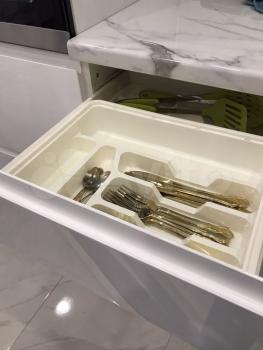 Гостинная и кухня совмещены. На кухне есть вся необходимая бытовая техника (встроенная духовка, посудомоечная машина, холодильник, сенсорная варочная панель, фильтр питьевой воды).