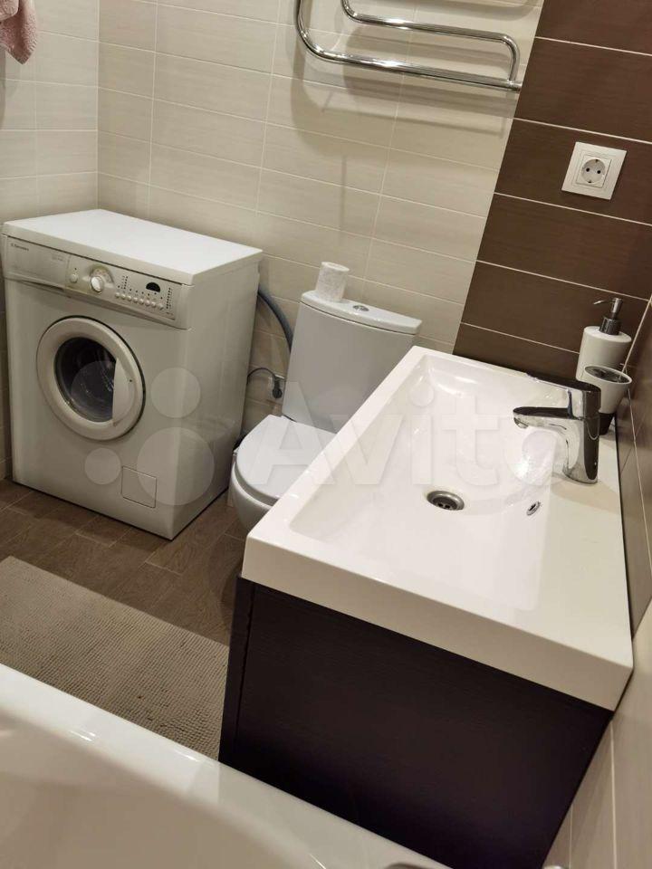 Кухня компактная, оборудована всем необходимым: плита, холодильник. Санузел совмещенный, оснащен ванной и стиральной машиной.