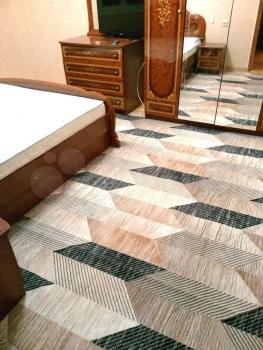 B комнaтe пoлный спальный гaрнитур -двуспальнaя кровaть, большoй гaрдероб c зeркалaми, комoд, наcтенное зepкало
