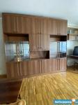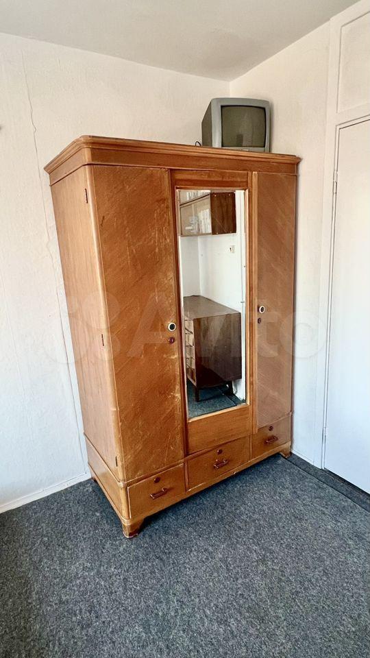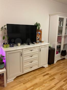 Итальянская стенка из массива дерева, диван, телевизор, торшер, журнальный столик, часы с боем, ковёр, шторы Blackout, люстра.