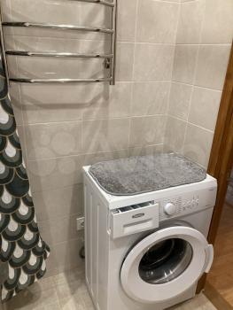 Кухня оснащена необходимой бытовой техникой: холодильник, плита, микроволновая печь и стиральная машина. Ванная комната и туалет раздельные, оформлены в современном стиле.