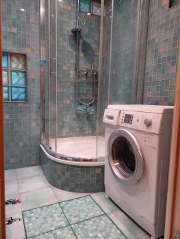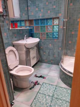 - стены в санузле отделанные мозаичной стеклянной плиткой с вставками из разноцветных стеклоблоков, производства Чехии, Италии,