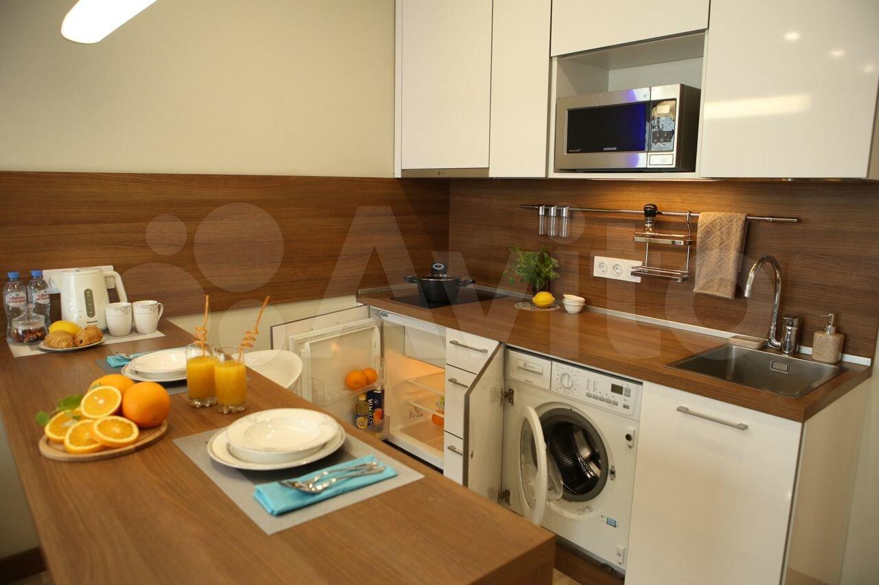 Кухня, оснащенная встроенной бытовой техникой: микроволновая печь, холодильник, керамическая варочная панель, портативная духовка;