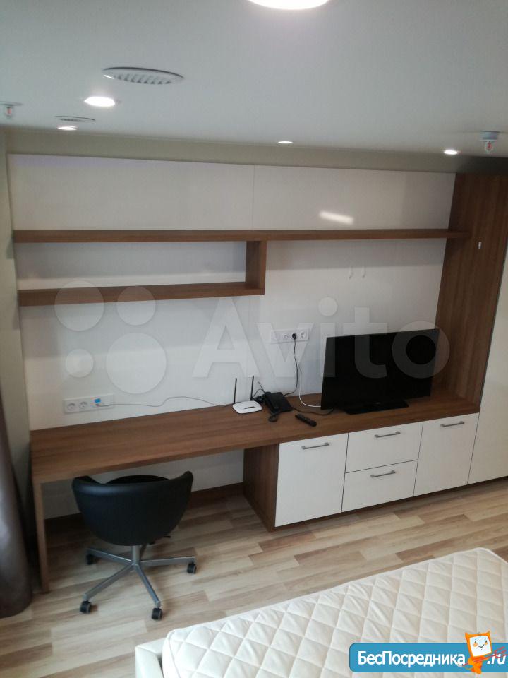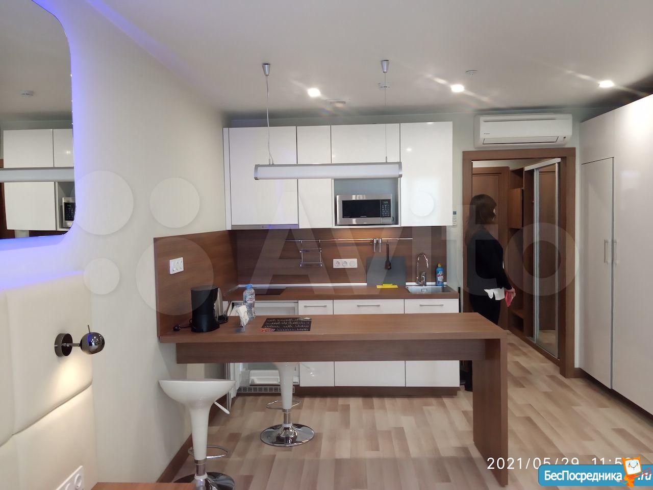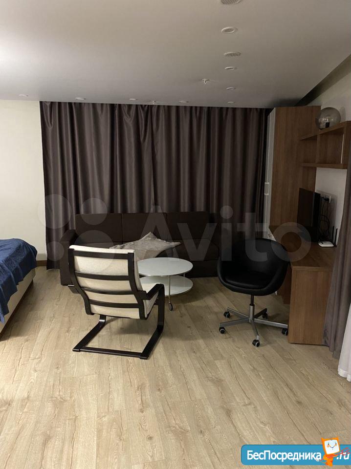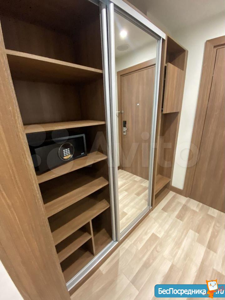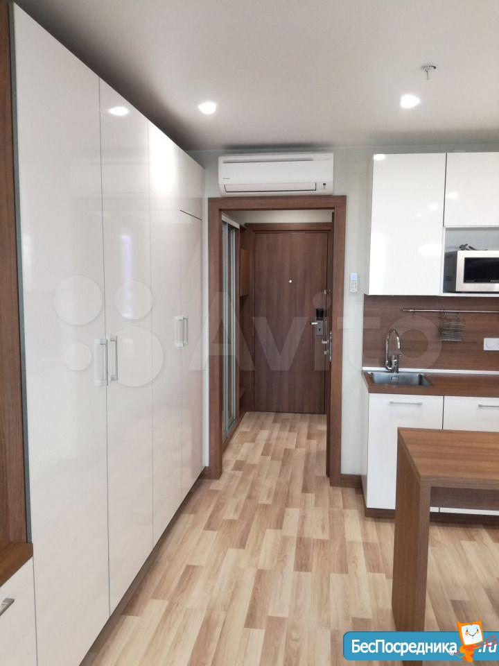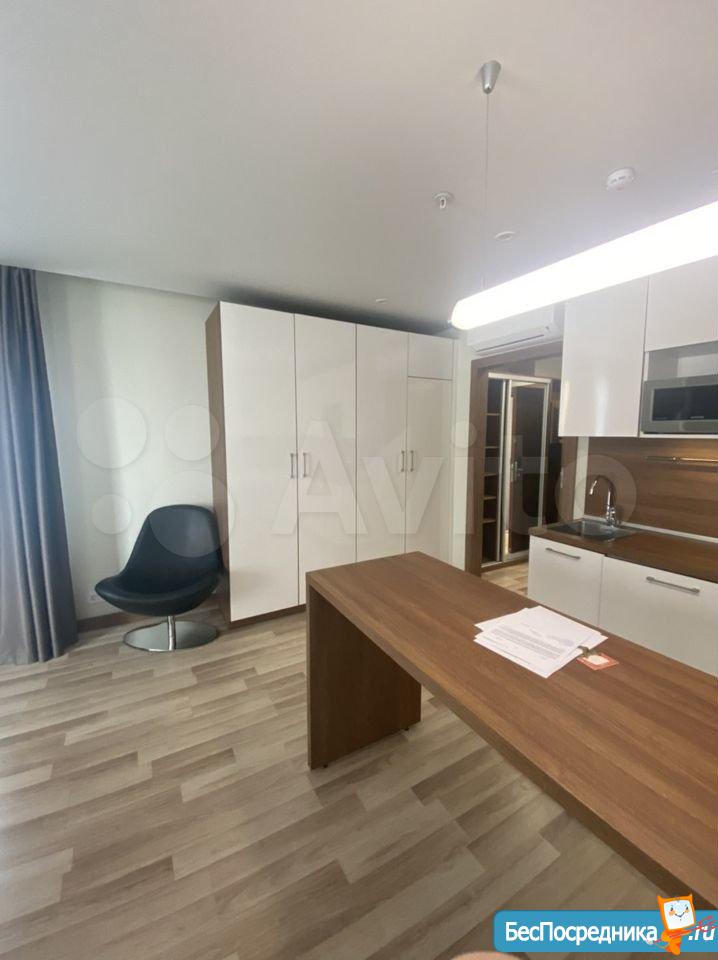 Студия с евроремонтом, от собственника, на долгий срок. Есть вся необходимая техника и даже посуда. Кондиционер. Холодильник. Телевизор. Варочная панель. Вытяжка. Стиральная машина. СВЧ (микроволновка). Подземный и наземный паркинг. 4 скоростных лифта. Дом охраняемый, бесплатная парковка под шлагбаум. На первом этаже ресепшн, в любое время суток можно позвонить и обратиться с просьбой. На ваш этаж чужие люди не поднимутся, так как подъем на лифте осуществляется по ключу, который есть только у жильцов дома. Очень безопасный дом.
