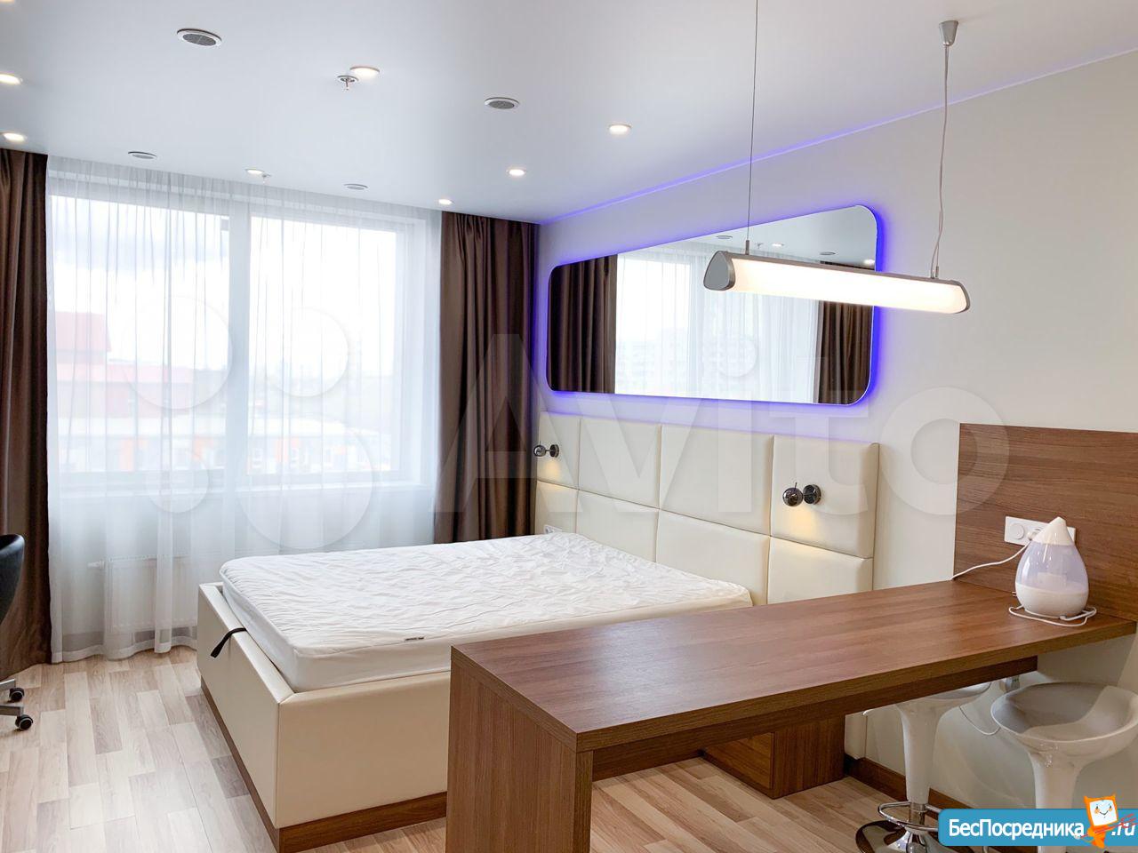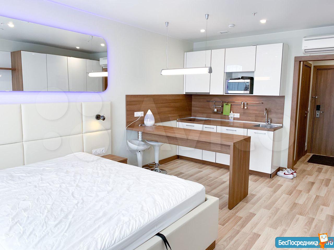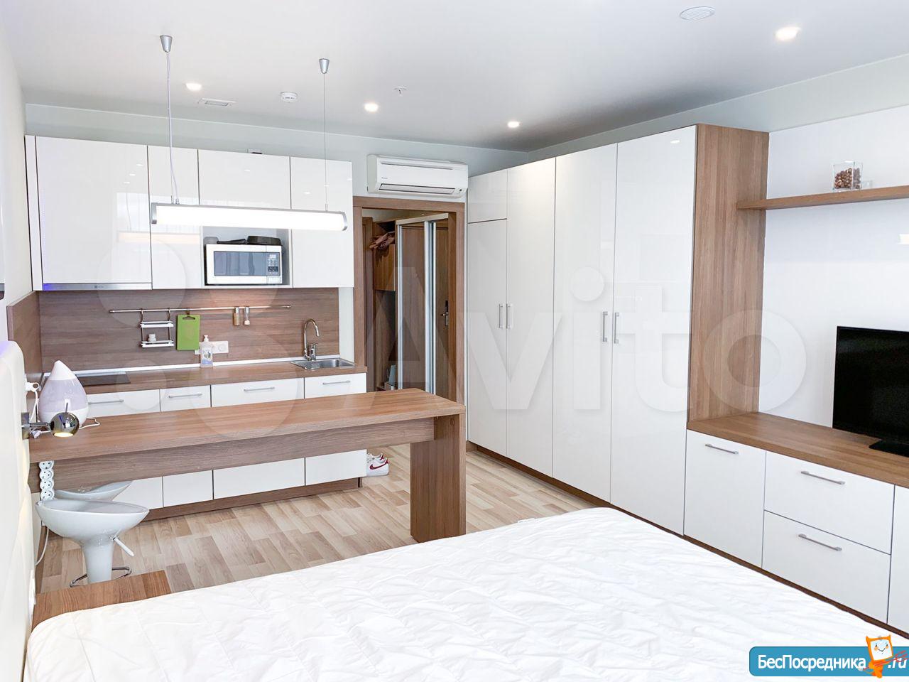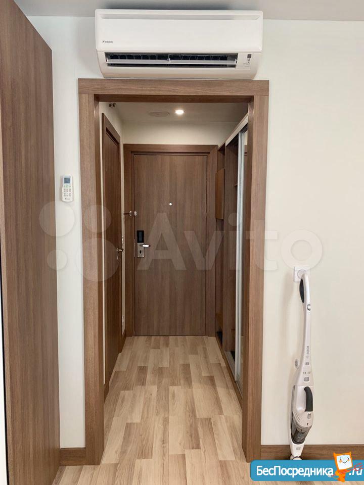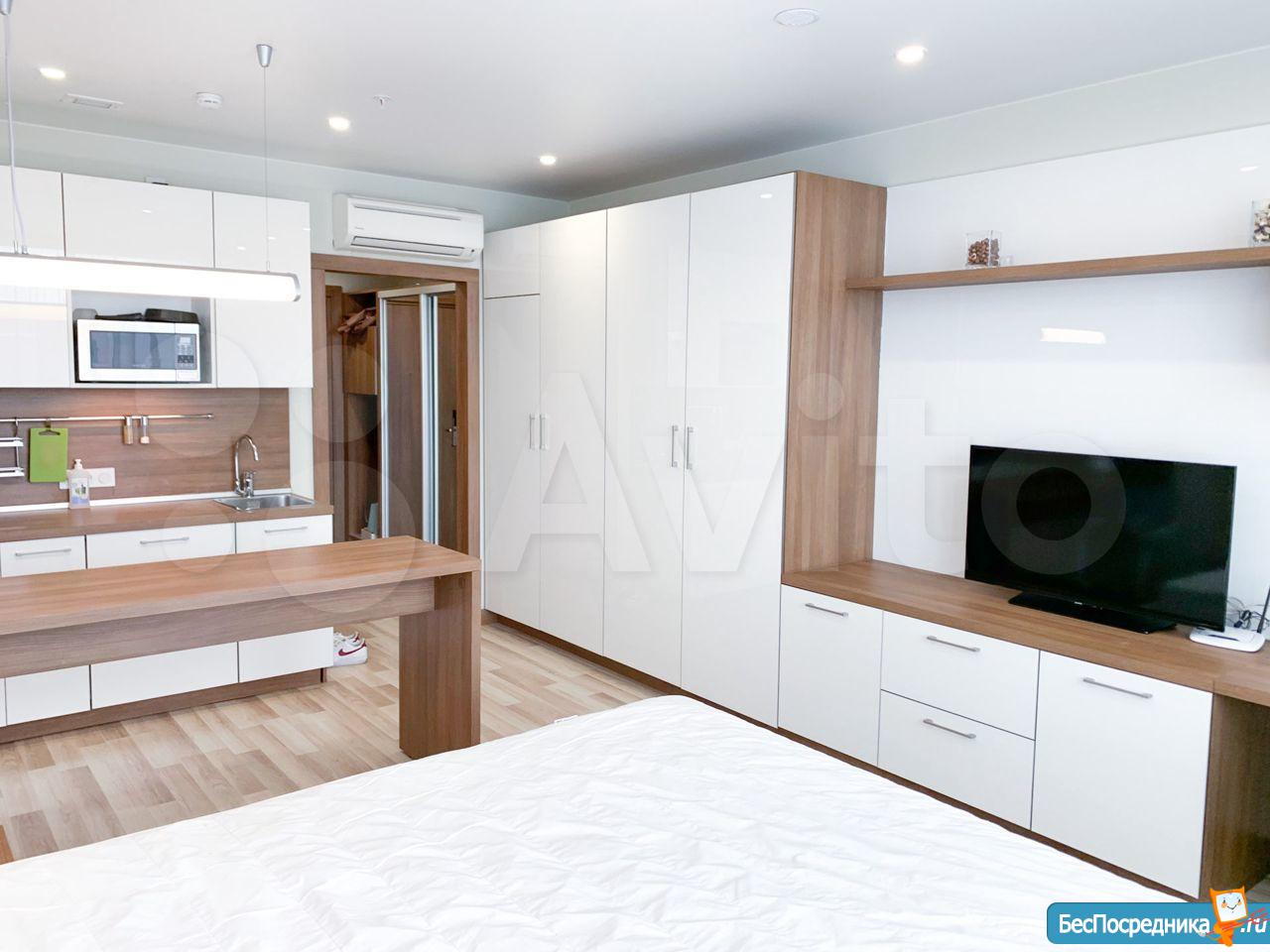 Студия с евроремонтом, от собственника, на долгий срок. Есть вся необходимая техника и даже посуда. Кондиционер. Холодильник. Телевизор. Варочная панель. Вытяжка. Стиральная машина. СВЧ (микроволновка). Подземный и наземный паркинг. 4 скоростных лифта. Дом охраняемый, бесплатная парковка под шлагбаум. На первом этаже ресепшн, в любое время суток можно позвонить и обратиться с просьбой. На ваш этаж чужие люди не поднимутся, так как подъем на лифте осуществляется по ключу, который есть только у жильцов дома. Очень безопасный дом.