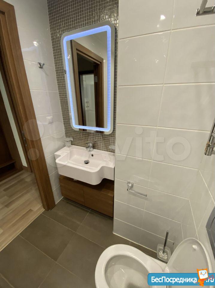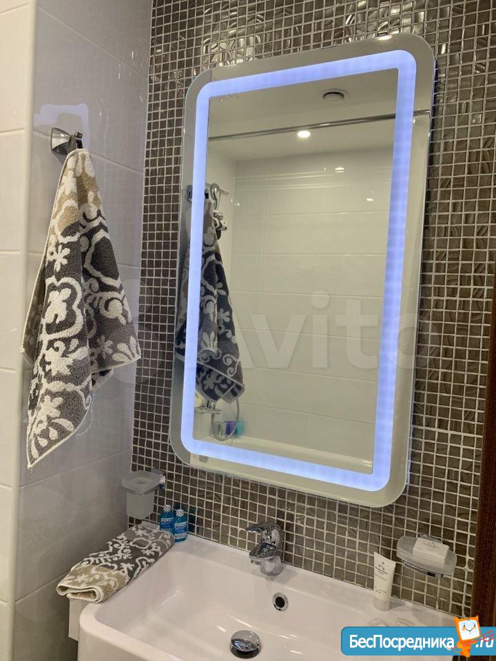 Комфортная ванная комната: большое зеркало с LED-подсветкой, полноценная ванна;