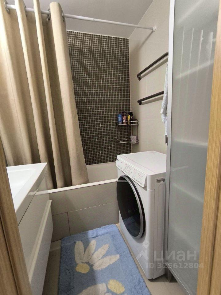 В ванной: новая стиральная машина, удобный шкафчик с зеркалом.