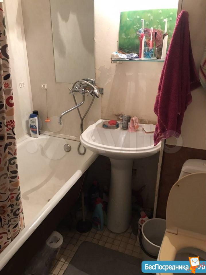 Санузел совмещенный, оснащен современной сантехникой и стиральной машиной. Из окон открывается вид на зеленый двор с детской площадкой и спортивной зоной.