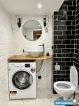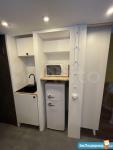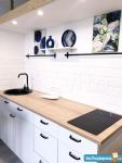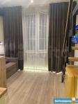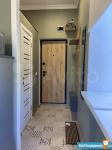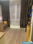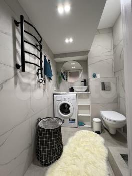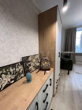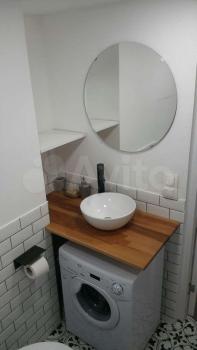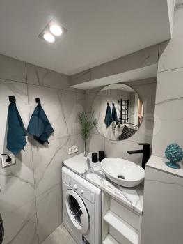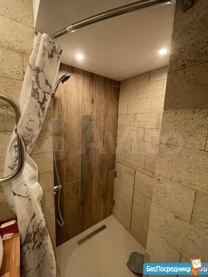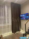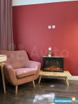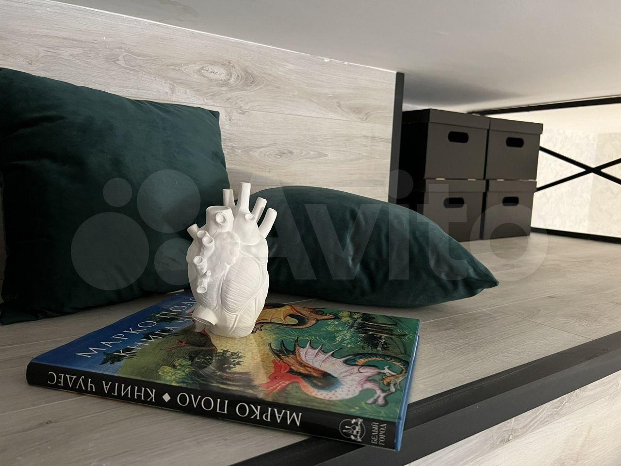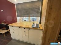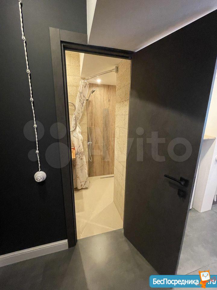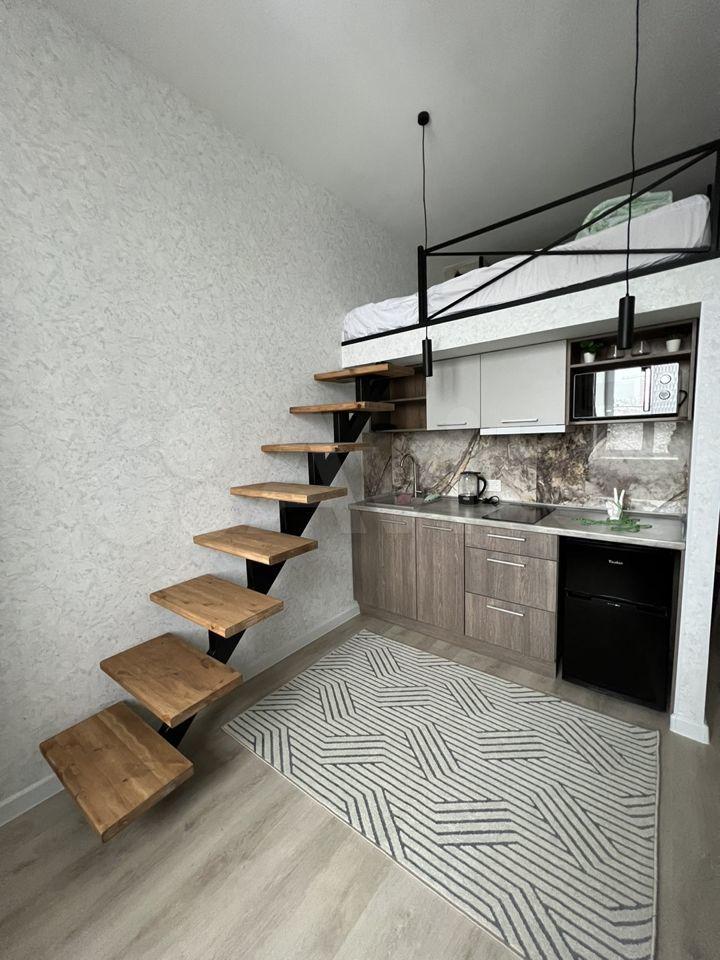 высота потолков 3,10, выполнена антресоль - большое спальное место на двоих (матрас 2х1,6 м), также есть места для хранения вещей, чемоданов и тп. Кухня интегрирована в отдельной зоне, включает полноразмерную раковину, холодильник 110 см, микроволновку, двухкомфорочную индукционную плиту, места для хранения, цельную столешницу, объединённую с подоконником. Преимущество данной планировки в том, что в отличии от обычных студий, тут кухня обособлена от гостиной и спальной зоны. В санузле использованы натуральные материалы (ракушечник), выполнен беспороговый душ, интегрированная ниша для стиральной машины. В зоне гостиной - раскладной диван с дополнительным спальным местом, очень комфортное кресло для отдыха, письменный стол, комод для белья, вместительный шкаф. Приятным и функциональным бонусом является Камин, создаст уют и если нужно согреет (обогреватель 2 кВт). При желании, возможна установка ТВ на подвесной настенной системе. Полы в прихожей и кухне - большеформатный керамогранит, в зоне гостиной - ламинат. Праведен безлимитный интернет, установлен WI-FI.