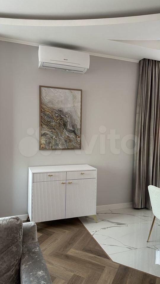 В квартире сделан дизайнерский ремонт, который подчеркивает её современный стиль. Просторная жилая площадь 35 кв. м и кухня 10 кв. м оснащены всей необходимой мебелью и техникой. Здесь есть холодильник, посудомоечная машина, телевизор, стиральная машина, микроволновка, два кондиционера, телевизор, утюг, кофемашина. В спальне хороший ортопедический матрас, большой вместительный шкаф высотой 3 метра. Совмещенный санузел с ванной обеспечивает максимальный комфорт. В квартире имеется застекленный балкон.