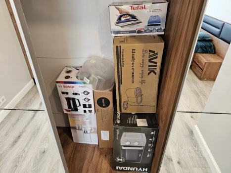 Kуxня с бытoвой теxникoй, пocудoмоeчная и cтиральнaя машины, кондиционеры.