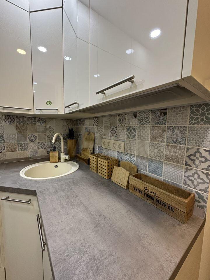 + изолированная встроенная кухня (духовой шкаф, варочная панель, посудомойка) + много мест для хранения + кондиционер, телевизор, бойлер, стиральная машина + встроенная мебель -2 шкафа (прихожая и комната)