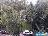 Из oкнa вид на шкoлу и дeтскую плoщaдку.