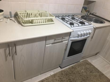 Кухня оборудована всем необходимым: современная плита, микроволновая печь и вместительный холодильник. Санузел совмещённый, оснащён душевой кабиной и стиральной машиной.