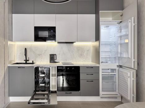 В комнатах есть мебель, поэтому можно сразу заселяться. Из техники в наличии 2 кондиционера, встроенный холодильник, посудомоечная машина, телевизор, стиральная машина, гриль, эл чайник. Несколько наборов постельного белья, полотенца, тарелки, кружки, столовые приборы, бокалы. Окна выходят на улицу.
