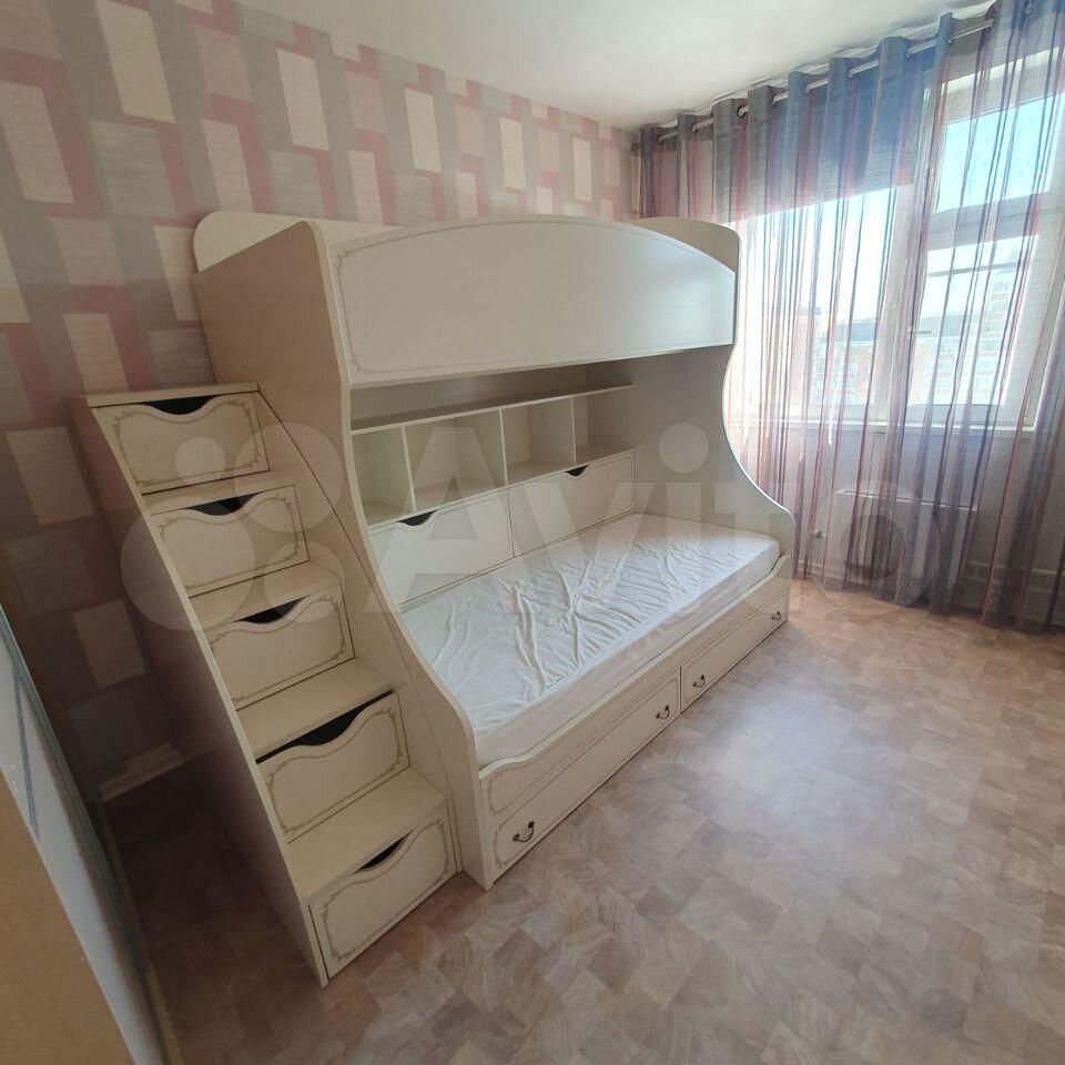 Шкаф-купе для хранения одежды, небольшой книжный стеллаж у окна, Двухъярусная кровать с полноценными спальными местами 90×200 см с ортопедическими матрасами и вместительной системой хранения (ящики, в т,ч в ступеньках, полки)