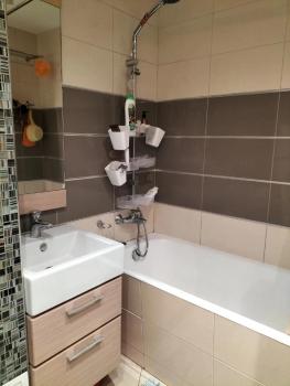 Площадь 42,2 м2 плюс застеклённый балкон. Был сделан ремонт с преобразованием пространства в отдельную спальню с двуспальной кроватью и кухню-гостинную, с сохранением раздельного санузла.