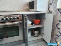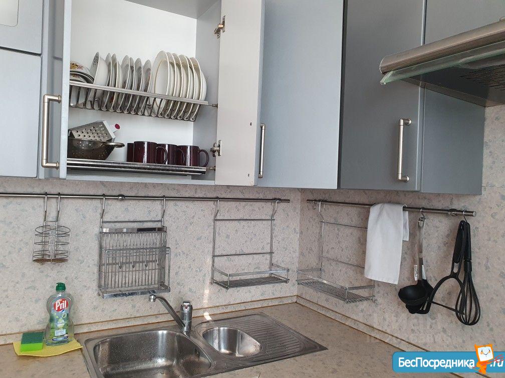Современная кухня, стеклокерамическая плита, микроволновая печь, холодильник, вся необходимая посуда.