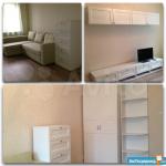 Имеется вся необходимая мебель, много шкафов, один двухспальный диван ( есть место поставить вашу кровать или диван ), письменный стол, шведская стенка с турником и доп.снарядами, бытовая техника.