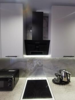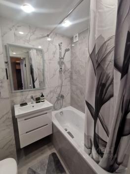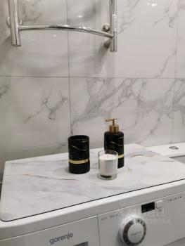 Ванна изготовлена под заказ, искусственный камень, двери под заказ, диван, холодильник, стол - все абсолютно новое.