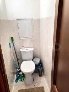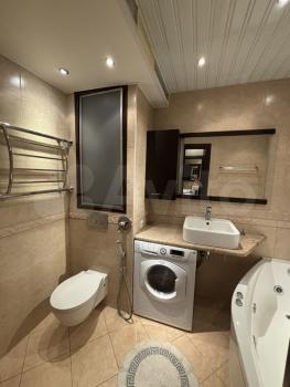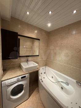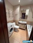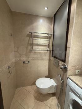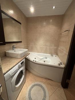 Санузел совмещенный, оформлен в светлых тонах и оснащен современной сантехникой, ванна с гидромассажнм. Лоджия застеклена и утеплена, что позволяет использовать ее круглый год.