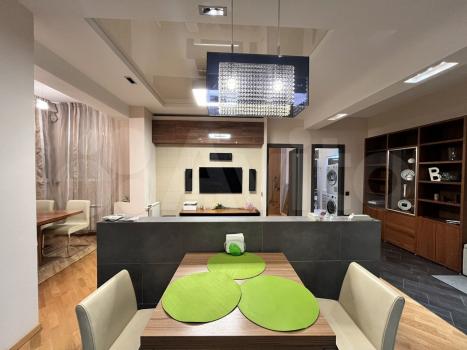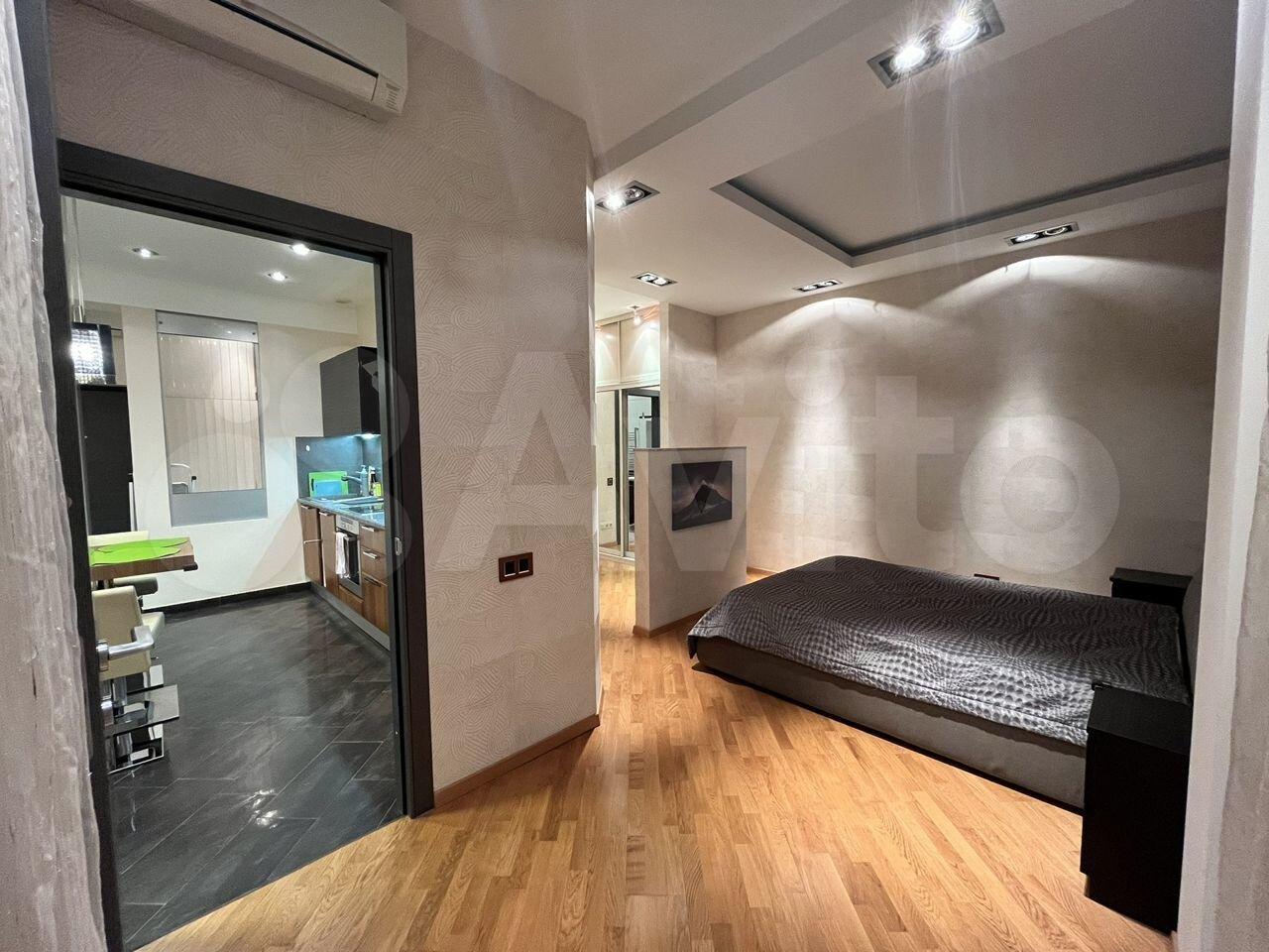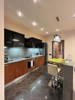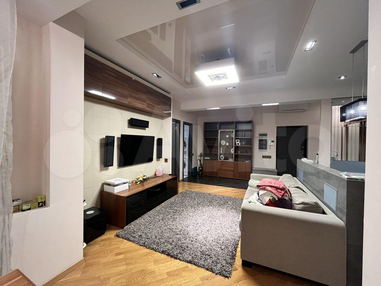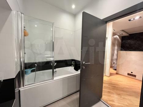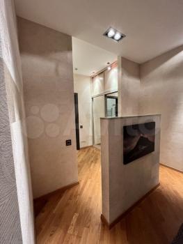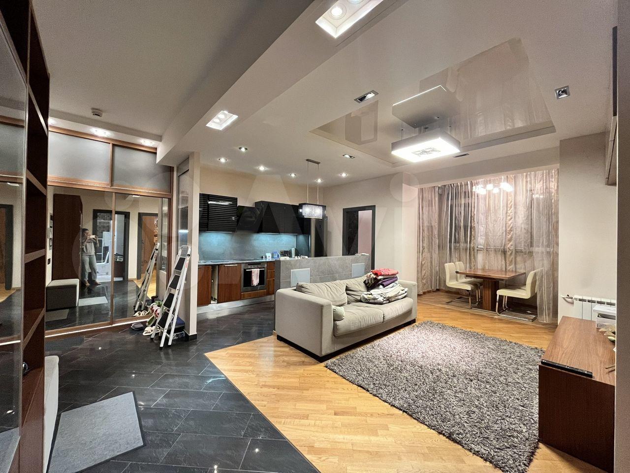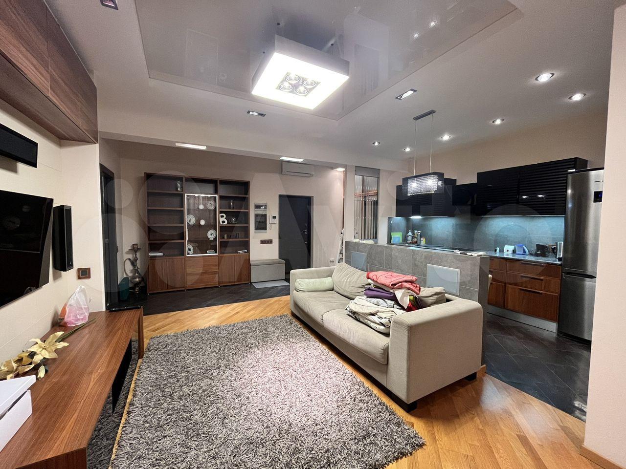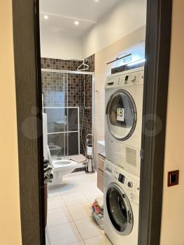 Общая площадь 75 кв м одна спальня ,гостинная+кухня , 2 сан узла , гардеробная ,комната - чулан